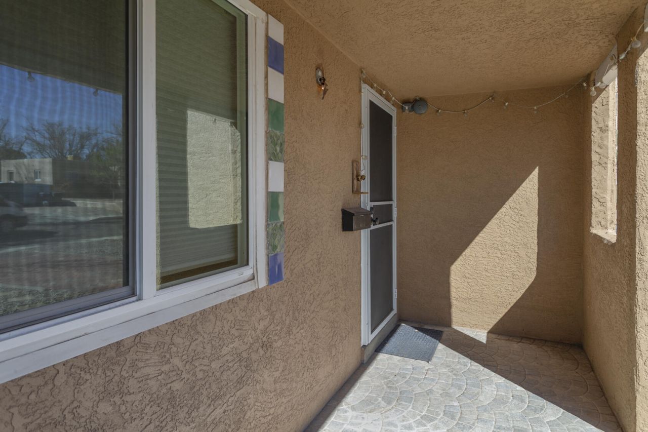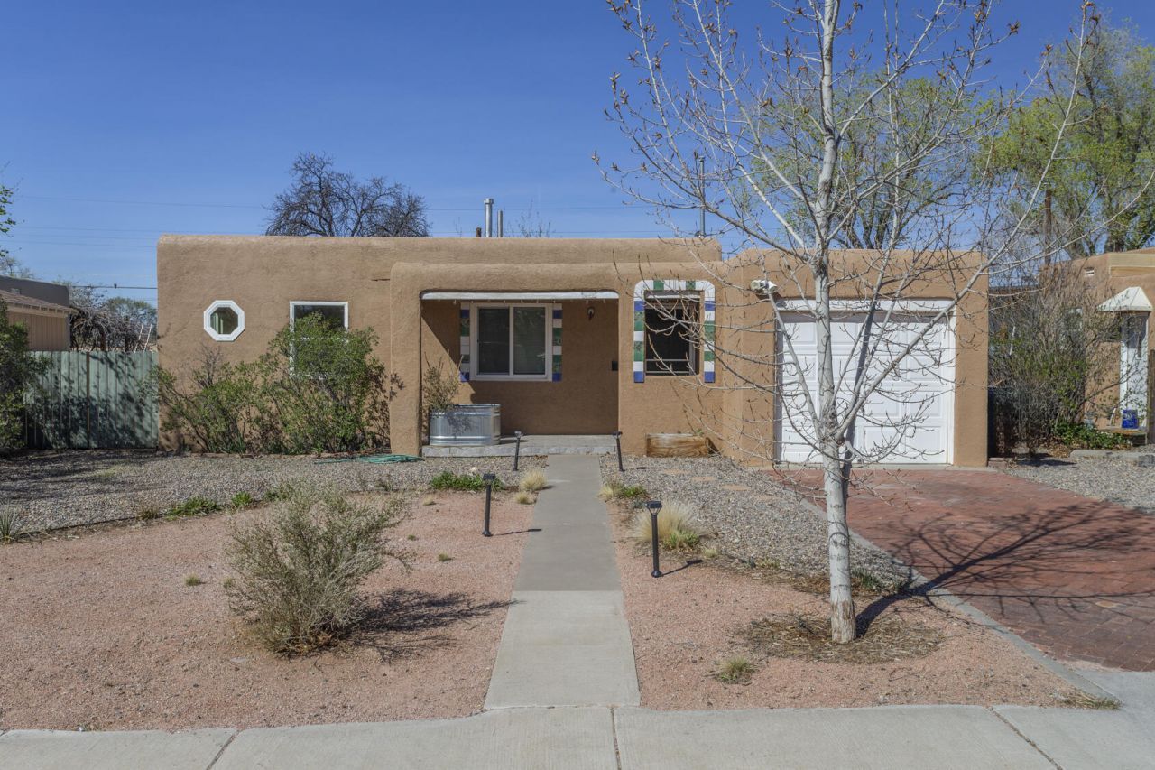 Summit Park/Loma Vista/UNM! Absolutely adorable bungalow with all the classic touches like hardwood floors and coved ceilings. Well maintained with upgraded electrical and refrigerated air. Remodeled kitchen packs a lot of punch with efficient use of space- granite counters, stainless steel appliances, and stacked washer/dryer. Two bedrooms. One full bath. Vinyl thermal windows + whimsical accent window. Huge backyard with coyote fence for privacy, elevated deck, pergola, open patio, and custom chicken coop. Gated side yard. Covered front porch. One car garage with opener; side-by-side off-street parking for 2 cars. Herringbone pattern brick driveway. Low-maintenance landscape. Blocks from Summit/Bataan Parks and conveniently close to Law/Med Schools, UNMH, Golf Course, and main campus.
