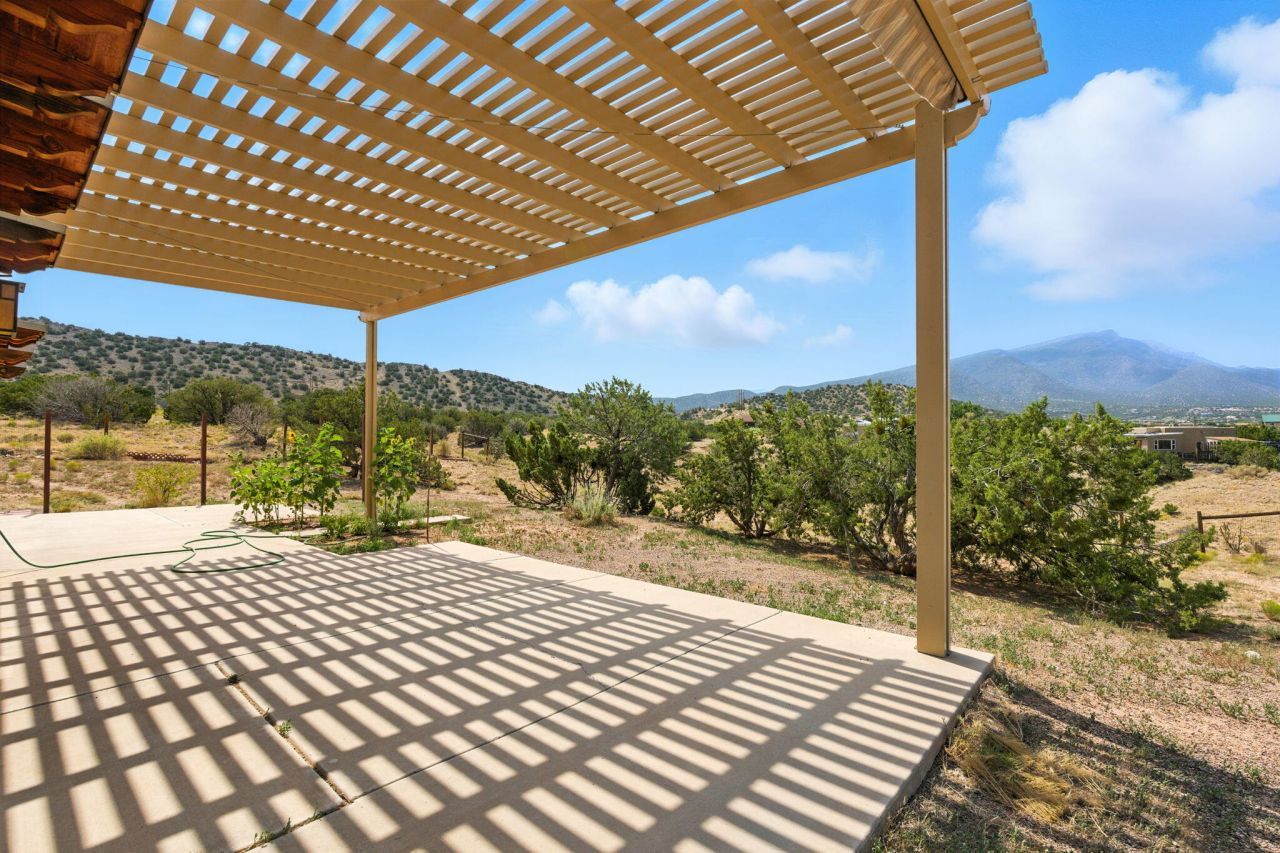 Panoramic view, stunning sunsets and incredible star gazing in the heart of Placitas, set back from the road for a private and quiet haven on 1.6 acres. Home offers high ceilings, skylights flooding the home with natural light, niches and archways. Open floorplan creates functional living spaces. Primary suite offers spa like bath, walk-in shower and separate soaking tub. Walk-in closet. 2nd bedroom is oversized. Efficient heating and cooling due to 3 mini split duct air systems along with baseboard heat makes the home comfortable year-round. Wood burning stove and whole home water softener. Property line goes beyond fenced area. Freshly coated roof.