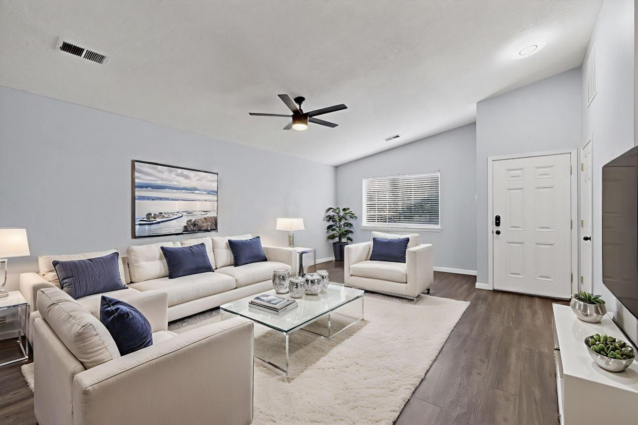 Located in the Country Meadows subdivision of Ventana Ranch, this single story, 3BR, 2BA home offers 1,400 sq. ft. of comfortable living space and a 2-car garage. The spacious great room features vaulted ceilings and flows seamlessly into the kitchen, complete with a breakfast nook, island, bar seating, and stainless steel appliances--including the refrigerator. The primary suite offers a large walk-in closet, open vanity area and double sinks. Enjoy the beautiful, low-maintenance backyard featuring a putting green, turf, and a covered patio--perfect for relaxing or entertaining. Additional highlights include solar panels (leased), refrigerated AC with smart thermostat and access to community amenities such as a pool and walking trails. Welcome home! Seller will consider owner financing.