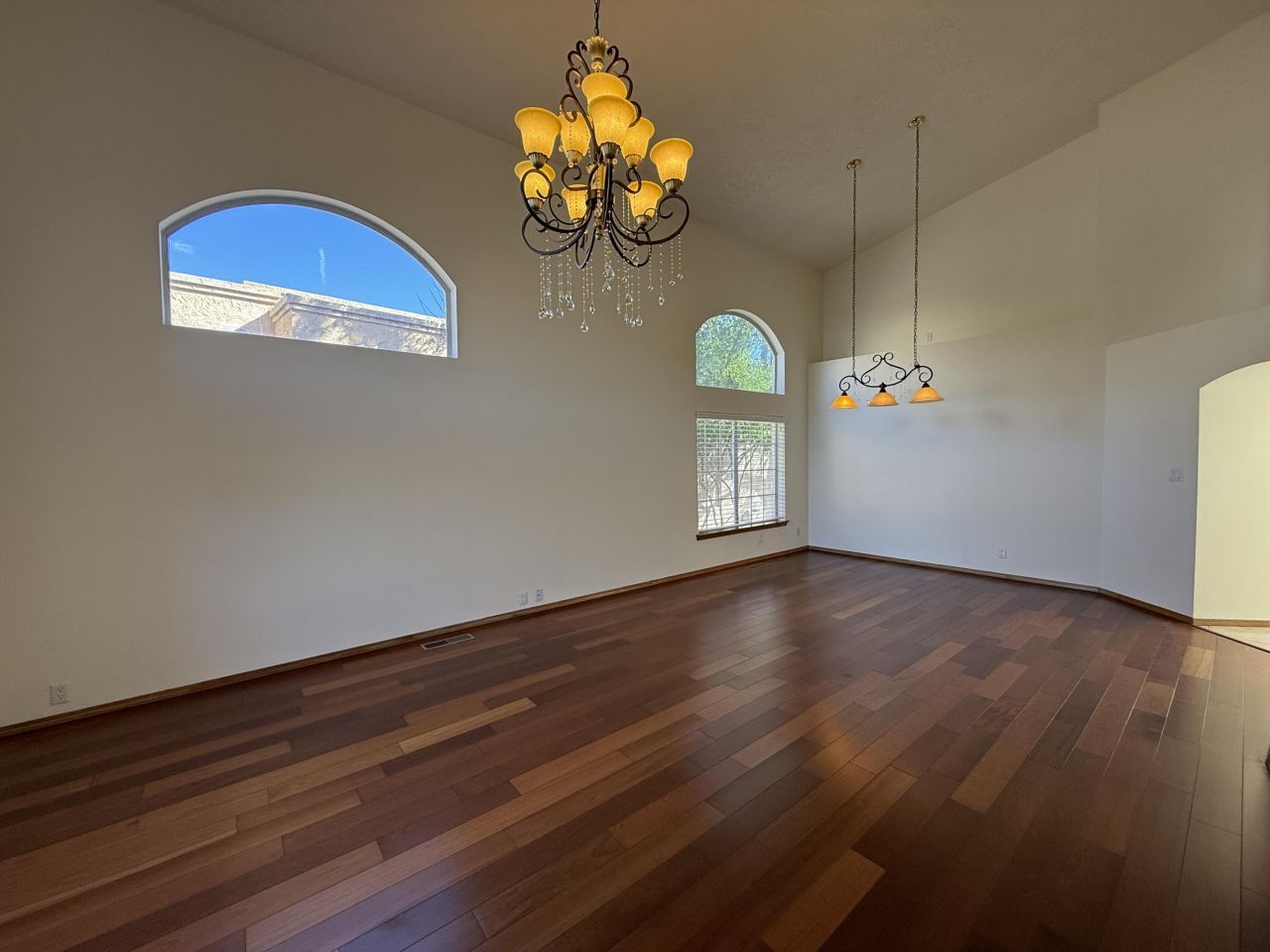 Large five bedroom home in sought after La Cueva school district. Backs to the open space of Nor Este park with walking and biking trails. Kitchen has upscale SS appliances to include a Bosch dishwasher, convection oven, range hood, granite and lots of cabinets. Kitchen is open to the breakfast nook and large tiled family room with gas fireplace. The living and formal dining rooms have Brazilian cherry wood floors. So does the generous sized bedroom downstairs. Primary suite has it's own balcony, a large bathroom with garden tub, separate shower, and walk in closet. Three car oversized garage with workshop space. Tile Roof was done in 2017. Refrigerated air added (two combo units) in 2019. Backyard access is possible. Seller is open to a flooring allowance with acceptable offer!!!
