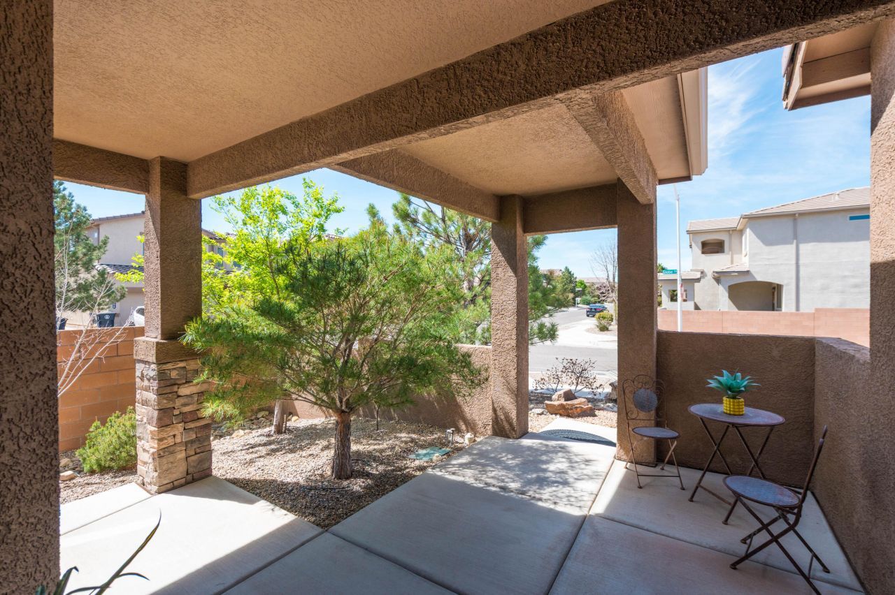 Experience luxury living located at 8800 Globe Street NW, this stunning Mediterranean-style home in Albuquerque's peaceful Tierra Vista at the Trails Community is designed to impress. Versatile floor plan complete with a gourmet kitchen that shines with granite countertops, stainless steel appliances, and a fantastic island/bar combo. The corner-lot residence features a convenient main-level bedroom that could be an ideal office, gym, or den. Second living area is located upstairs opening to a private balcony with breathtaking views of the Sandia Mountains. Meticulously maintained backyard includes mature trees, covered patio with updated acrylic flooring and durable Trex decking. This move-in-ready gem is located near top-rated schools, shopping, and scenic local parks.